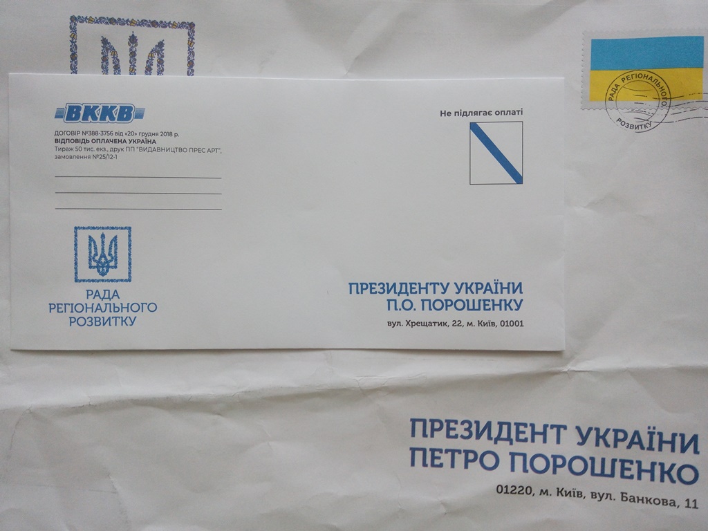Поза тим, у наборі наявний спецконверт, який дає можливість надіслати безкоштовну відповідь Президенту. На ньому вказано, що відповідь оплачена (договір №388-3756 від 20 грудня 2018 року. А наклад їх становить 50 тисяч екземплярів.