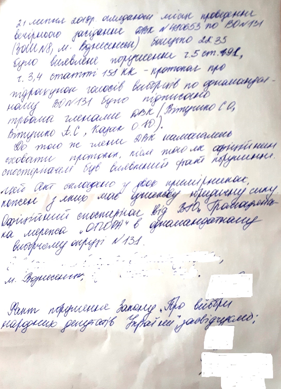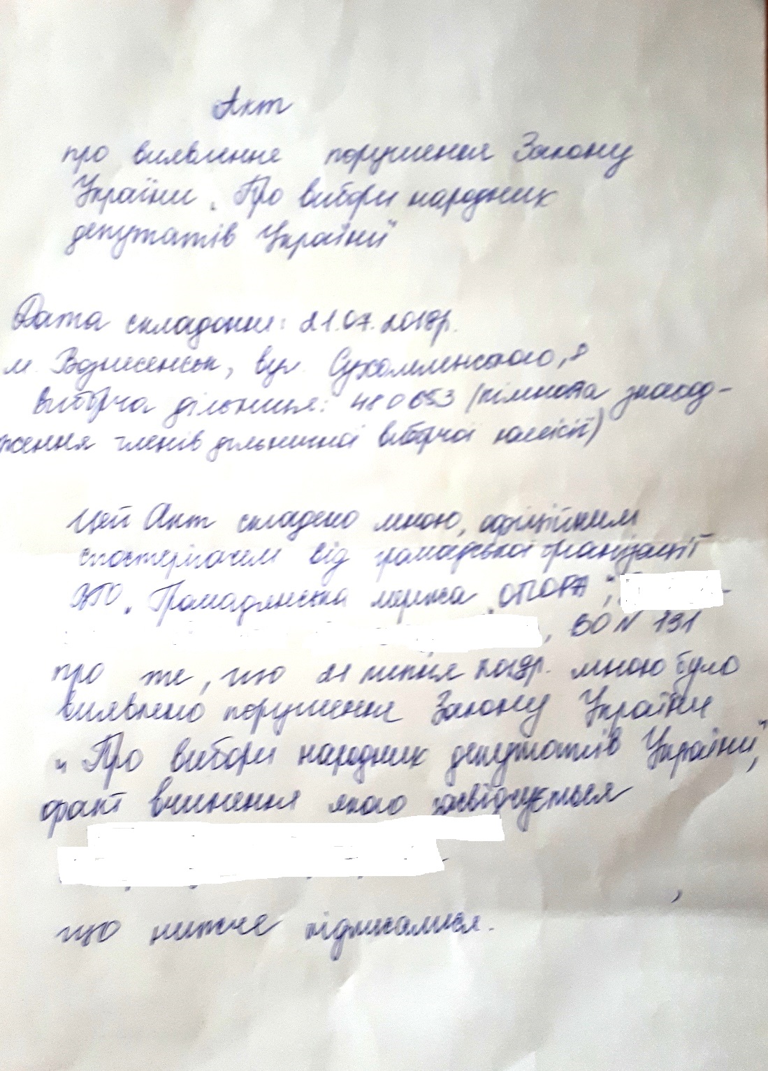 В одномандатному виборчому окрузі №131 на дільниці №480653, спостерігачка ОПОРИ під час підрахунку голосів 21 липня о 22.35 помітила на столі протокол, в який були вписані прізвища трьох членів комісії, навпроти них стояли підписи. Після фіксації даного факту члени ДВК намагались сховати протокол. Спостерігачка ОПОРИ одразу склала акт про це порушення, його підписали ще дві особи.