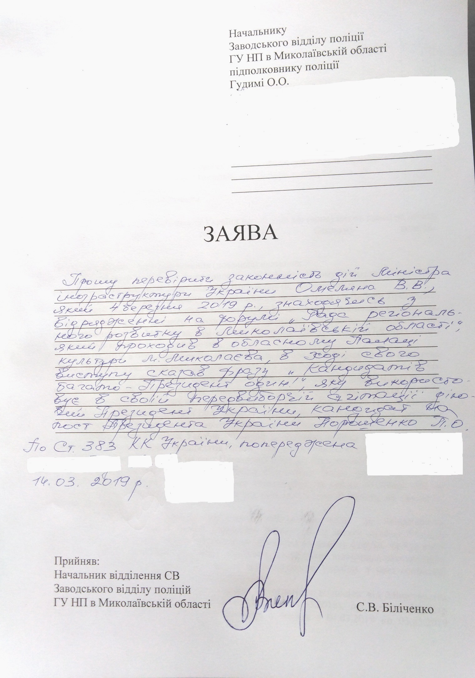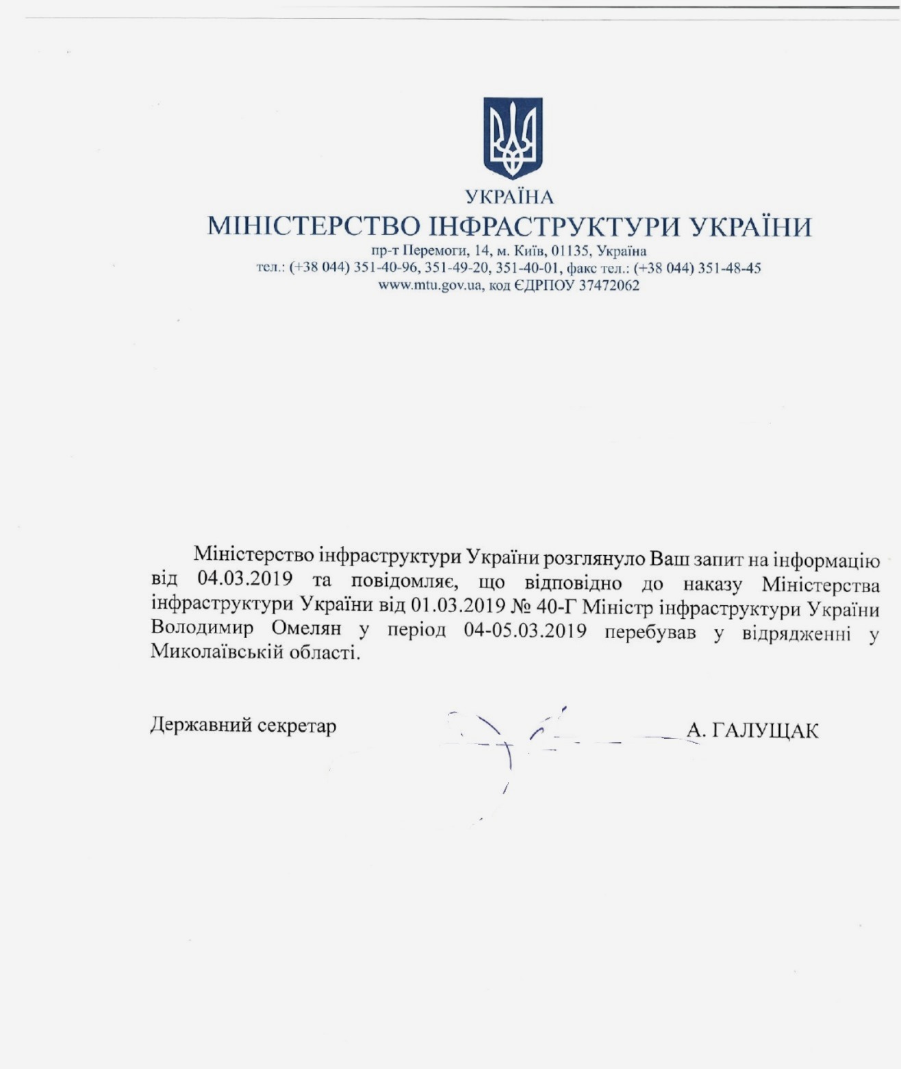 У Міністерстві інфраструктури підтвердили, що міністр у період із 4.03.19 по 5.03.19 офіційно перебував у відрядженні в Миколаївській області. За даним фактом 14 березня спостерігач ОПОРИ подав відповідну заяву до поліції.