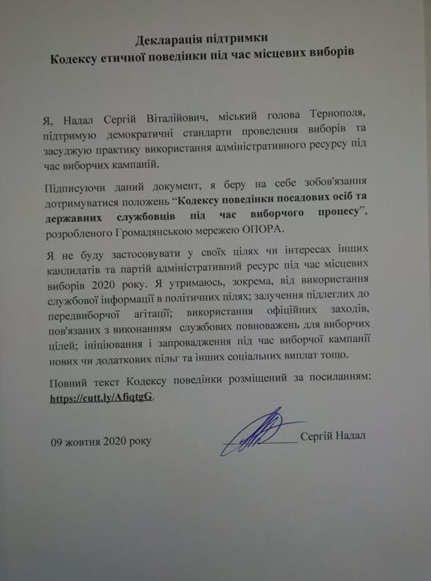 9 жовтня міський голова Тернопільської громади Сергій Надал підписав Декларацію підтримки Кодексу етичної поведінки під час місцевих виборів, який розробила Громадянська мережа ОПОРА. Документ містить основні етичні вимоги до поведінки посадових осіб та державних службовців під час виборчого процесу з метою уникнення дій, що можуть класифікуватися як зловживання адміністративним ресурсом.
