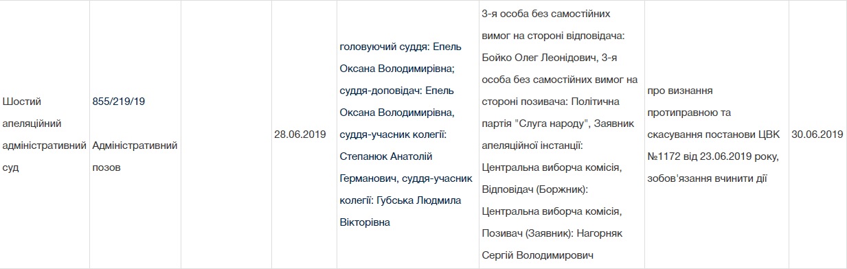 30 червня Шостий апеляційний адмінсуд Києва частково задовольнив клопотання. Він зобов’язав ЦВК внести зміни до постанови про реєстрацію Бойка і виключити звідти його інформацію про членство в партії «Слуга народу».