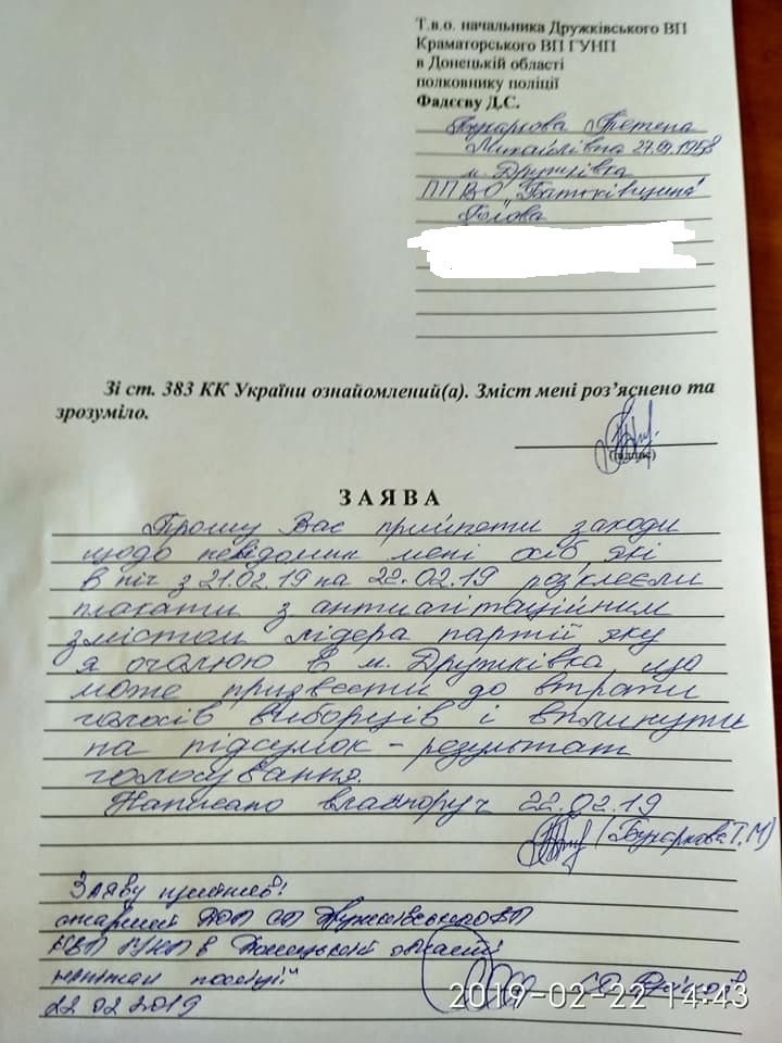 «Прошу вас прийняти заходи щодо невідомих мені осіб, які розклеїли плакати з антиагітаційним змістом лідера партії, яку я очолюю у Дружківці, що може призвести до втрати голосів виборців і вплинути на підсумок – результати голосування», - йдеться у заяві поліції від Тетяни Бухаркової та Михайла Самородова.