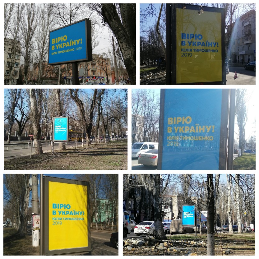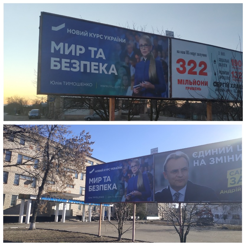 15 лютого білборди Юлії Тимошенко без даних про установу, що здійснила друк, їх тираж та осіб, відповідальних за друк, спостерігачі ОПОРИ побачили в Херсоні, селі Іванівка та селищі Новотроїцьке.