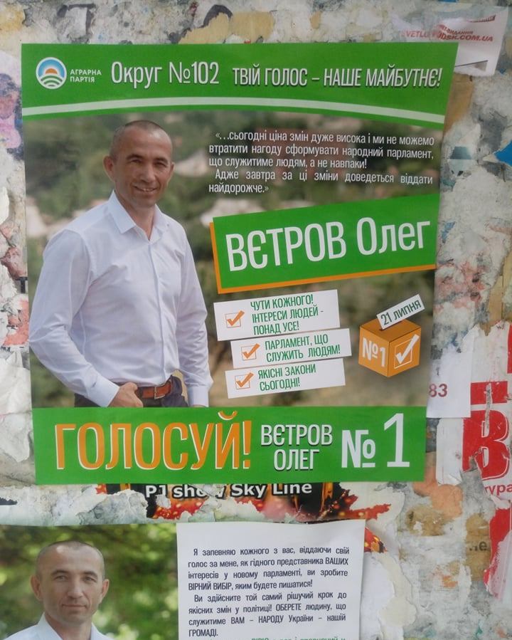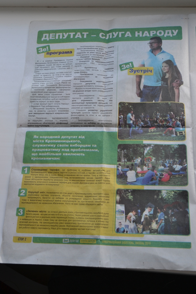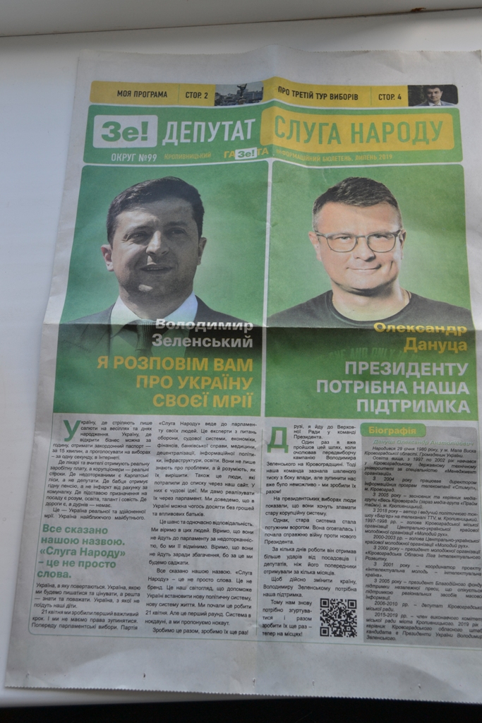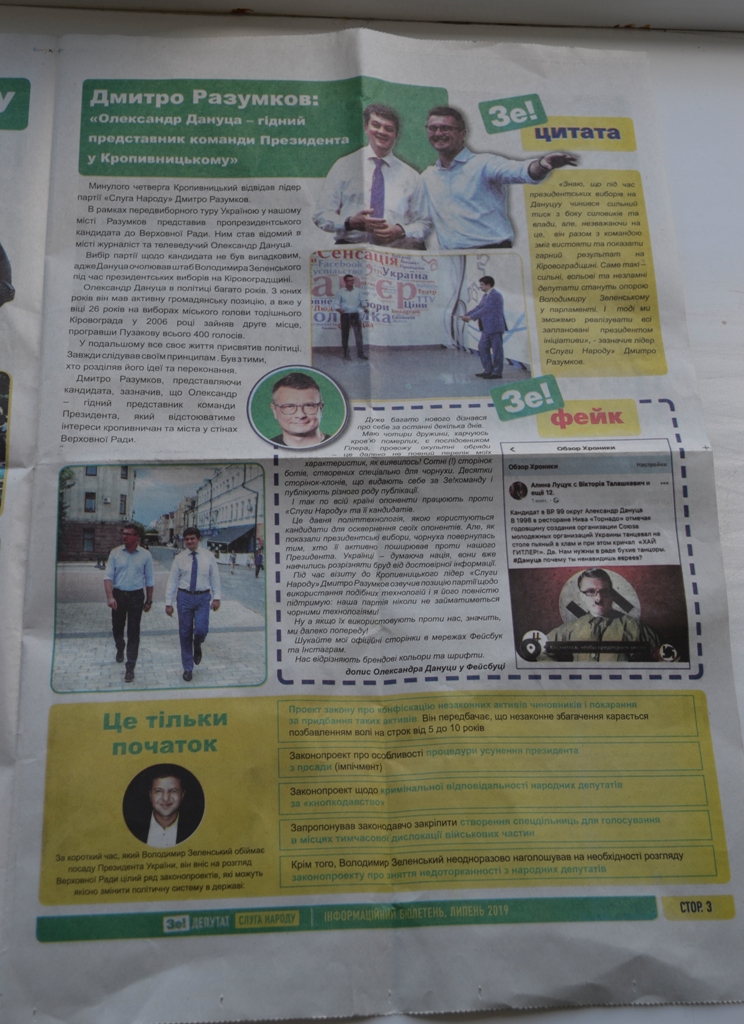 У місті Кропивницькому зафіксували, що на постері Аграрної партії у вихідних даних замовником матеріалу зазначено кандидата у народні депутати в окрузі № 99 Івана Марковського, хоча він не є розпорядником фонду партії. Також в обласному центрі на підприємствах «Радій», «Гідросила» та «Ельворті» розповсюджували інформаційний бюлетень «Зе!депутат. Слуга народу» без вихідних даних. У виданні розміщені матеріали про кандидата у народні депутати в окрузі № 99 Олександра Дануцу, чинного Президента України Володимира Зеленського, приїзд лідера партії «Слуга народу» Дмитра Розумкова. А також зустрічі містян з кандидатом у нардепи. Жодних даних про тираж, замовника та інше немає.