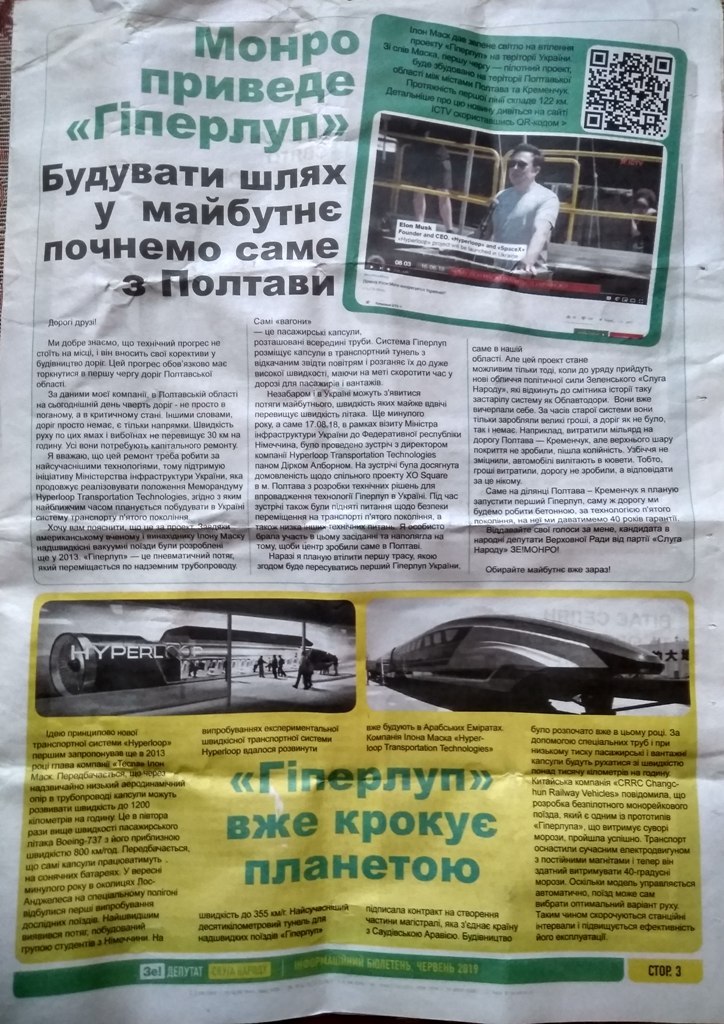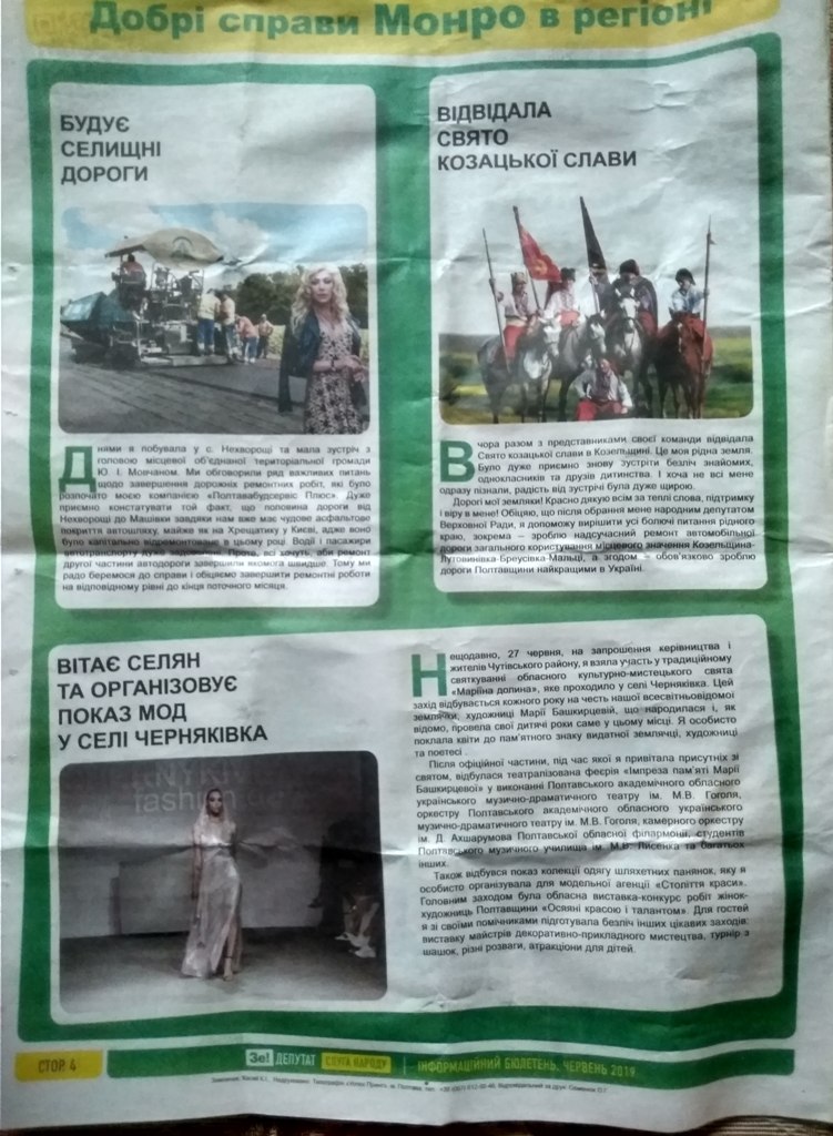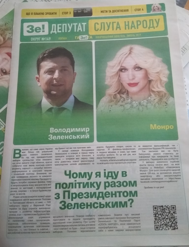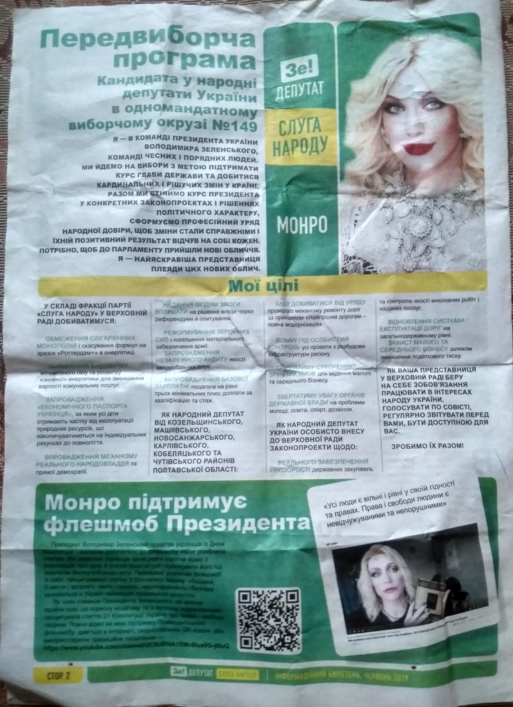 Як повідомляють представники ОПОРИ, газети знаходились на столі в адмінбудівлі, де розташовано Новосанжарські райдержадміністрацію та райраду. Газета має ідентичну назву та стиль з офіційною друкованою агітацією партії «Слуга Народу». Складається з чотирьох сторінок, на яких розповідається, що кандидатом від партії на виборах народних депутатів в виборчому окрузі №149 є травесті-діва Монро.
