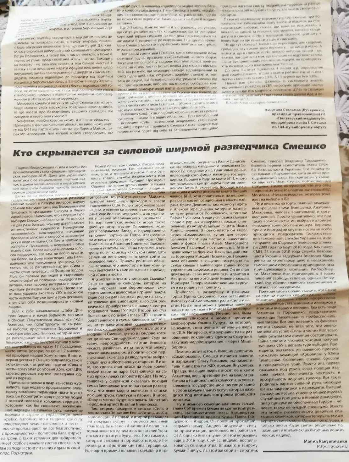 На першій сторінці містився матеріал під назвою «Другий «феномен» Смешка: мало хто з політиків так стрімко втрачав прихильників…». З іншої сторони розміщено текст під назвою «Кто скрывается за силовой ширмой разведчика Смешко». Обидва матеріали містять інформацію, котра може негативно впливати на репутацію Ігоря Смешка як політика. Листівка не містила вихідних даних.