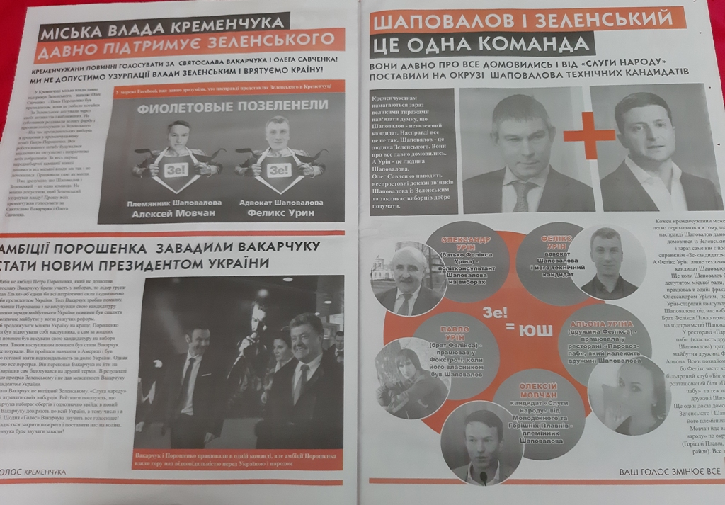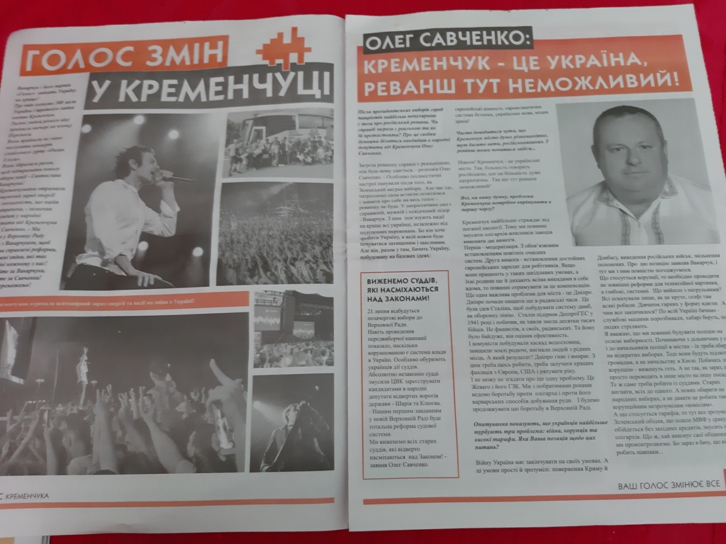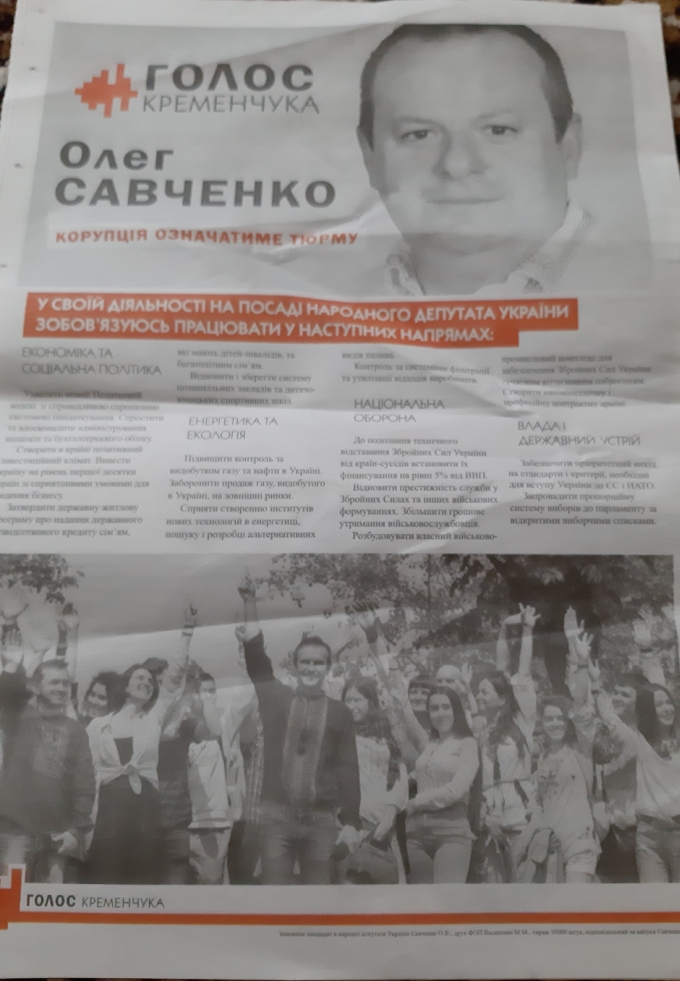 11 липня в Кременчуці спостерігачі ОПОРИ зафіксували розповсюдження газети «Голос Кременчука», в якій міститься інформація про начебто приналежність кандидата самовисуванця в 146 виборчому окрузі Олега Савченка до партії «Голос». Газета складається з восьми сторінок. В газеті міститься інформація про візит Святослава Вакарчука до Кременчука з презентацією партії «Голос», передвиборчі обіцянки Олега Савченка, а також публікації з ознаками «чорного» піару проти представників «Слуги Народу» та кандидата самовисуванця в Юрія Шаповалова. Замовником газети вказано кандидата в народні депутати Олега Савченка.