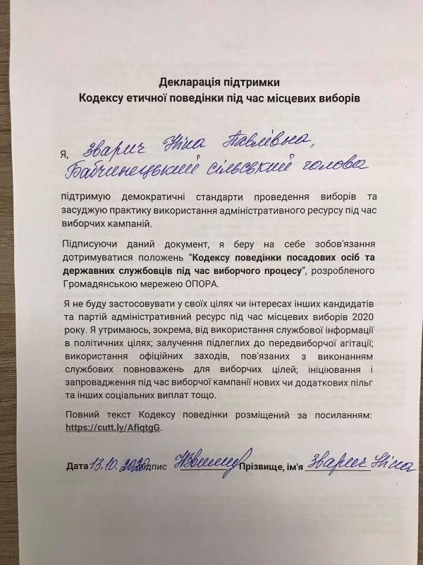 Голова Бабчинецької сільської ради Ніна Зварич підписала Кодекс етичної поведінки під час місцевих виборів 2020 року, розроблений Громадянською мережею ОПОРА.