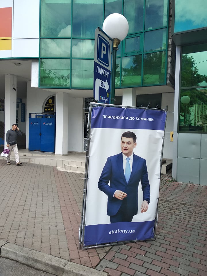 На вулицях Вінниці розташовані банери з фото лідера політичної партії «Українська стратегія Гройсмана» Володимира Гройсмана та написом «Українська стратегія Гройсмана», які не мають вихідних даних. Такі банери, зокрема, зафіксовано на проспекті Коцюбинського.