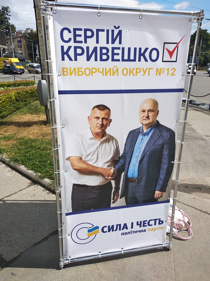 Так, у місті Вінниця розміщено банер кандидата у народні депутати по виборчому округу №12 Сергія Кривешка (суб’єкт висування – політична партія «Сила і честь») без вихідних даних. Банер із фото кандидата та написом «Сергій Кривешко. Виборчий округ №12. Так, ми зможемо. Сила і честь. Політична партія» розміщено біля тролейбусної зупинки на площі Перемоги.