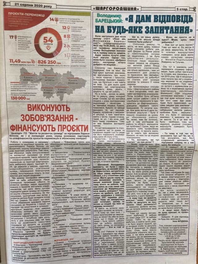 Два метеріали про колишнього заступника голови ОДА, а нині начальника регіонального управління Рахункової палати опублікувала в серпні газета «Шаргородщина»: під заголовкамим «Який він, Володимир Барецький?» (14 серпня) та «Володимир Барецький: «Я дам відповідь на будь-яке запитання» (21 серпня).
