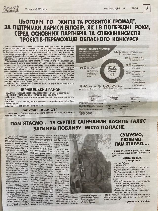 Матеріали позитивного змісту про діяльність народної депутатки Лариси Білозір (виборчий округ № 15, самовисування) та очолюваної нею громадської організації опублікувала низка районних газет округу. Так, публікація під заголовком «Цьогоріч ГО «Життя та розвиток громад, за підтримки Лариси Білозір, як і в попередні роки, серед основних партнерів та співфінансистів проєктів-переможців обласного конкурсу» вийшла в газеті «Чернівецька зоря». Аналогічні статті під назвою «Виконують зобов’язання – фінансують проєкти» вийшли також у газетах «Прибузькі новини», «Шаргородщина» та «Наше Придністров’я» (усі без маркування).