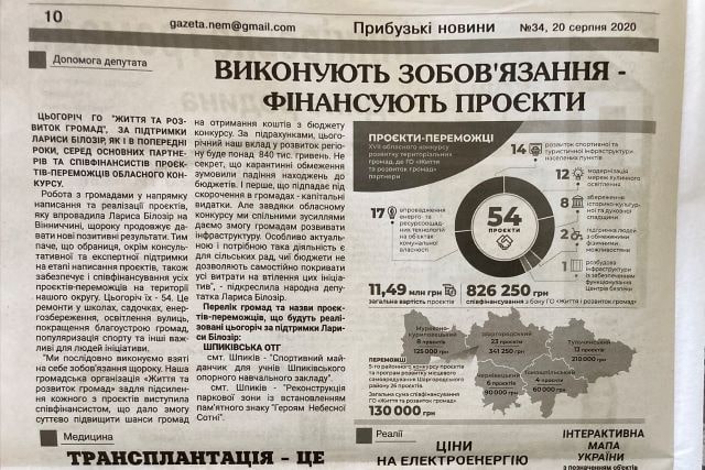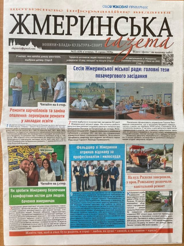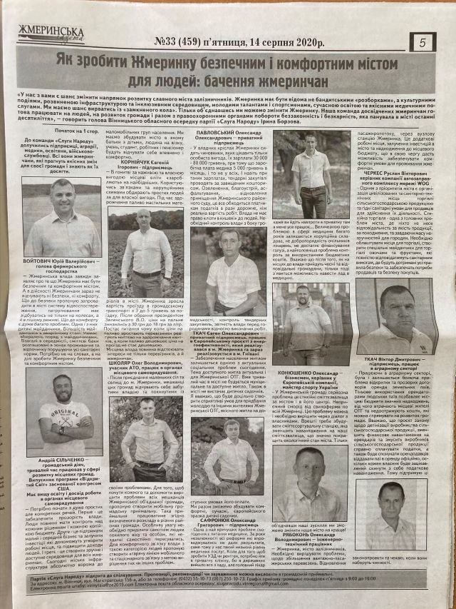 Також у «Жмеринській газеті» була розміщена публікація з розповіддю Ірини Борзової про ремонт доріг (стаття під назвою «Ірина Борзова: Від Жмеринки до Вінниці ремонтують дорогу. Ділянки траси розширять»). У цій же газеті надрукована розлога презентація жмеринської команди «Слуги народу» («Як зробити Жмеринку безпечним і комфортним містом: бачення жмеринчан»).