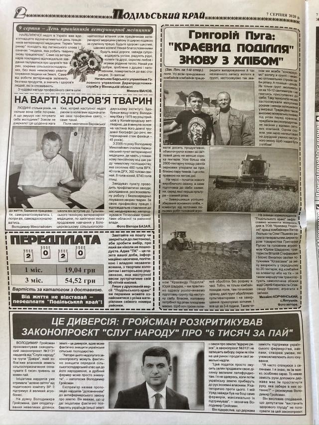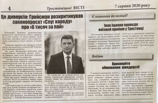 Статтю на користь лідера партії «Українська Стратегія Гройсмана» Володимира Гройсмана під заголовком «Це диверсія: Гройсман розкритикував законопроєкт «Слуг народу» про «6 тисяч за пай» надрукували, зокрема, газети «Тростянецькі вісті» (без маркування), «Подільський край» (без маркування), «Бершадський край» (без маркування), «Шаргородщина» (без маркування), «Ладижин – Нове місто» (марковано літерою «R»), «Сільські новини» (марковано зірочками).