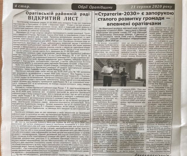 Також у серпні в деяких районних друкованих ЗМІ області були розміщені матеріали з ознаками замовності на користь політичної партії «Українська Стратегія Гройсмана». Так, газета «Обрії Оратівщини» надрукувала статтю під назвою «На Оратівщині до «Української Стратегії Гройсмана» долучаються лідери місцевого самоврядування й бізнесу» (марковано зірочками). Ця ж газета 21 серпня надрукувала матеріал «Стратегія-2030» є запорукою сталого розвитку громади – впевнені оратівчани». У ньому йдеться, зокрема, про те, що розробки стратегій розвитку громад Вінниччини ініційовано колишнім прем’єр-міністром України Володимиром Гройсманом, також що «нова, прогресивна й рушійна команда, яку очолює Володимир Гройсман, уже своїми діями і досягненнями підтримує вірний європейський курс України»). Матеріал подано без маркування.