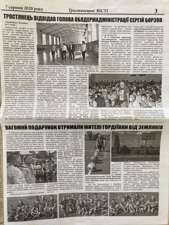Публікацію на користь депутата обласної ради Геннадія Мазура надрукувала газета «Тростянецькі вісті». Так, у статті «Вагомий подарунок отримали жителі Гордіївки від земляків» ідеться про те, що новий спортивний майданчик збудовано «за сприяння депутата обласної ради, уродженця села Геннадія Мазура» та сільської ради. Також у тексті розповідається, що майданчик «є третім, побудованим завдяки сприянню Геннадія Мазура».