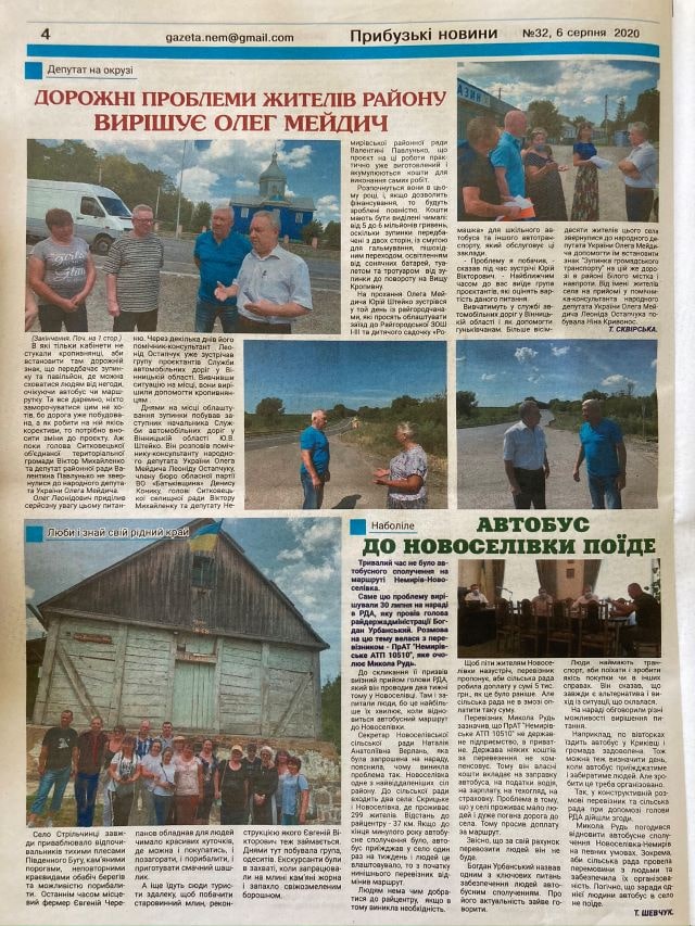 У газеті «Прибузькі новини» (Немирівський район) було розміщено публікацію народного депутата Олега Мейдича (виборчий округ №18, ВО «Батьківщина») під заголовком «Дорожні проблеми жителів району вирішує Олег Мейдич». «Олег Леонідович приділив серйозну вагу цьому питанню. Через декілька днів його помічник-консультант Леонід Остапчук уже зустрічав групу проєктантів Служби автомобільних доріг у Вінницькій області…», - йдеться, зокрема, у статті. Цей матеріал подано в рубриці «Депутат на окрузі».