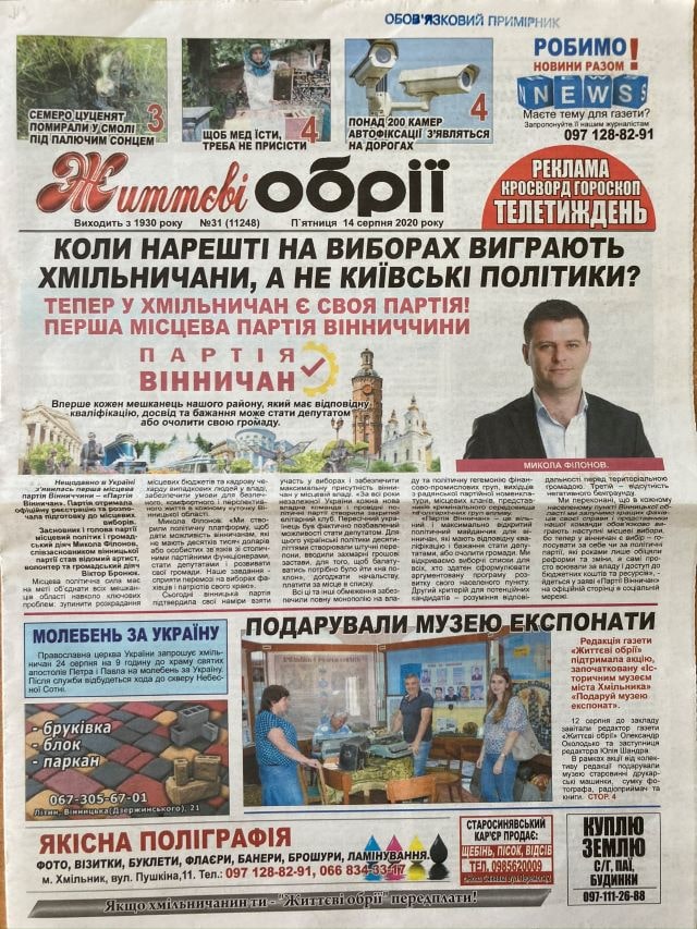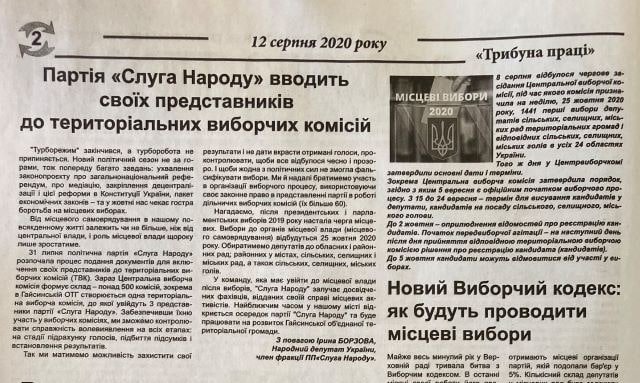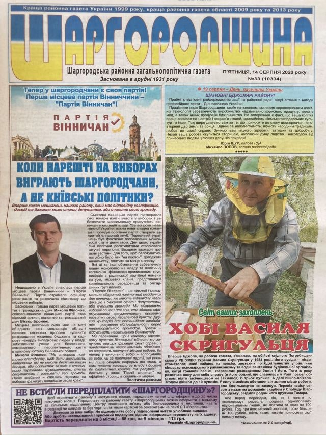 У районних друкованих ЗМІ Вінницької області протягом серпня 2020 року публікувалось десятки матеріалів політичної тематики з ознаками замовності на користь партій та політиків всеукраїнського і місцевого рівня. Переважна більшість цих публікацій не маркована як політична реклама.