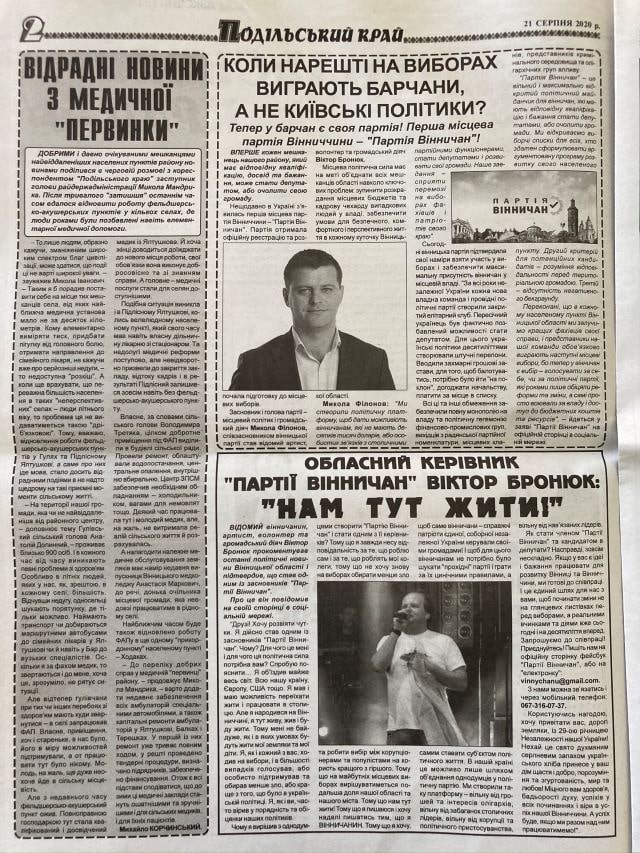 У серпні в переважній більшості районних газет області вийшла публікація, яка популяризує політичну партію «Партія Вінничан». У різних газетах заголовки цього тексту були побудовані за єдиним шаблоном: спочатку питання «Коли нарешті на виборах виграють… (далі підставлялося слово на позначення жителів певного району – «барчани», «літинчани», «мурованокурилівчани»…), а не київські політики?». Потім у підзаголовку містилась відповідь про те, що тепер у жителів певного району «…є своя партія! Перша місцева партія Вінниччини – «Партія Вінничан»!»