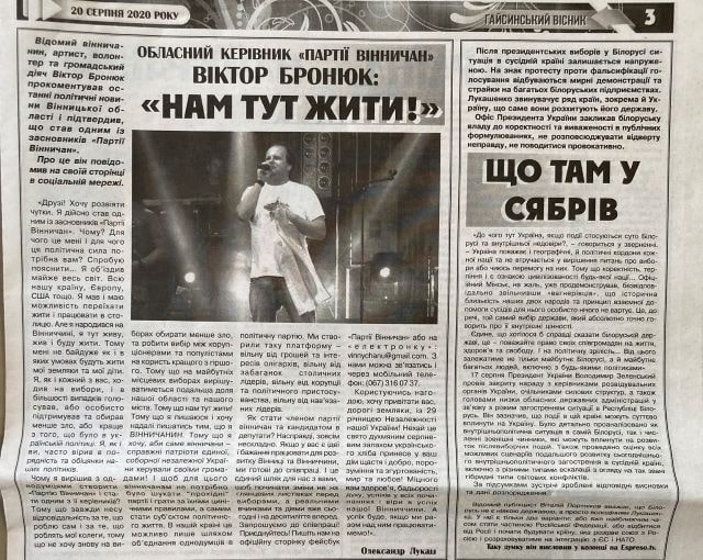На користь цієї ж політсили низка місцевих друкованих ЗМІ розмістила статтю під заголовком «Обласний керівник «Партії Вінничан» Віктор Бронюк: «Нам тут жити!». У публікації йдеться про те, що співак, громадський діяч і волонтер Віктор Бронюк підтвердив, що став одним із засновників цієї партії, також розповідається «як стати членом «Партії Вінничан» і кандидатом в депутати» та вказується контактний телефон політсили.