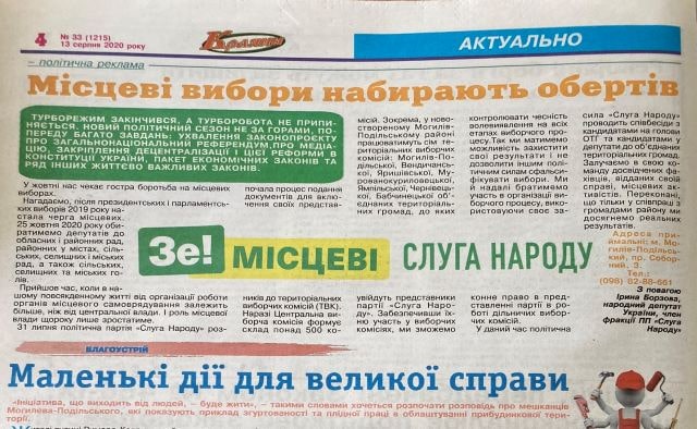 Низка місцевих газет у серпні публікувала матеріали на користь партії «Слуга народу». Так, у газеті «Слово Придністров’я» було опубліковано статтю під назвою «Місцеві вибори набирають обертів»; у газетах «Трибуна праці» і «Чернівецька зоря» статтю «Партія «Слуга Народу» вводить своїх представників до територіальних виборчих комісій»; у газетах «Наше Придністров’я», «Тростянецькі вісті», «Вісті Тепличчини» та «Краяни» статтю «Україна – це ти!».