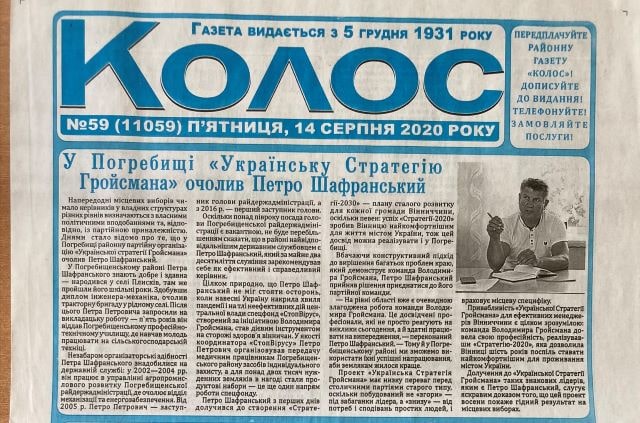 У газеті «Липовецькі вісті» вийшла публікація під назвою «У Липовці «Європейську Стратегію Гройсмана» очолив міський голова Микола Грушко» (без маркування). У газеті «Колос» теж вийшов матеріал про розробку стратегії розвитку громади соратниками Володимира Гройсмана («Погребище до 2030 року – стратегія розвитку», марковано зірочками). У цій же газеті вийшли стаття «У Погребищі «Українську стратегію Гройсмана» очолив Петро Шафранський (не марковано як політична реклама).