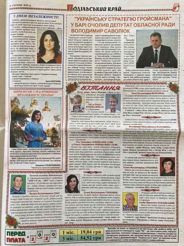 Також газета «Подільський край» надрукувала статтю «Українську Стратегію Гройсмана» у Барі очолив депутат обласної ради Володимир Саволюк» (без маркування).