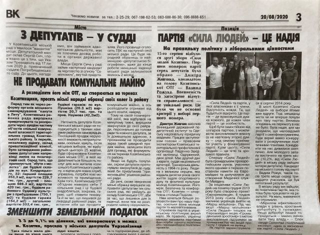 Матеріал з ознаками замовності на користь «Сили людей» зафіксовано в газеті «Вісник Козятинщини» за 20 серпня. У статті «Партія «Сила людей» - це надія на правильну політику з ліберальними цінностями» йдеться про збори осередку «Сили Людей» у Козятині, про висунення кандидатів від цієї партії на місцевих виборах тощо. Матеріал подано без маркування.