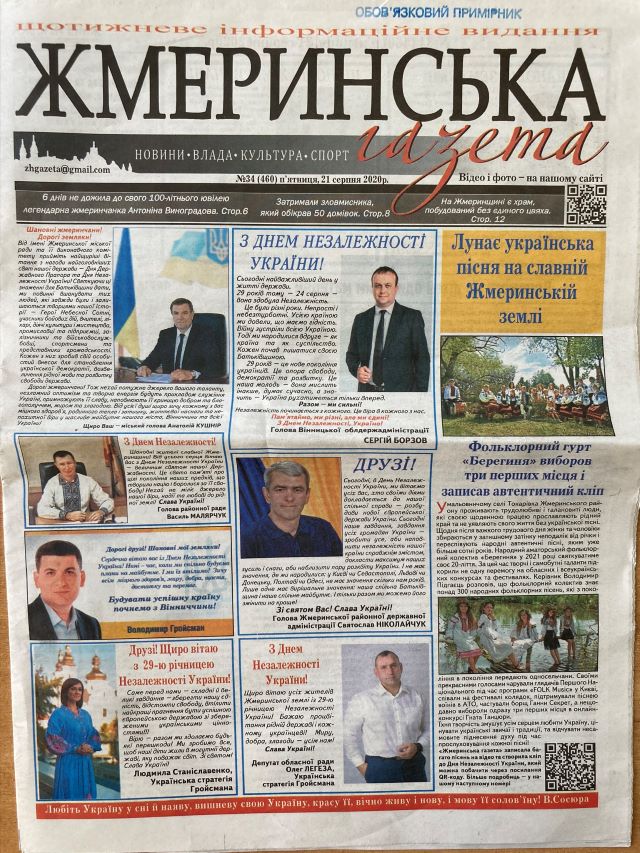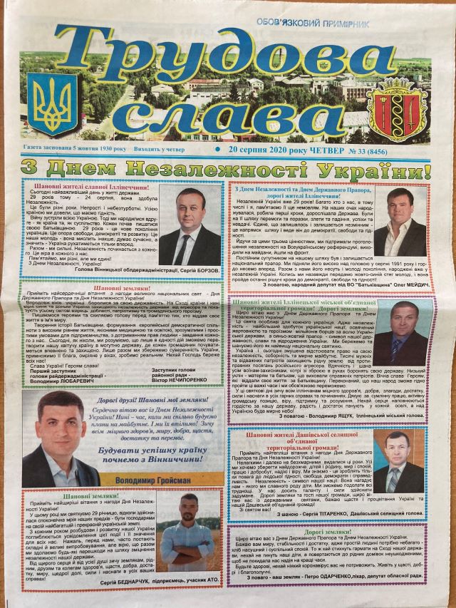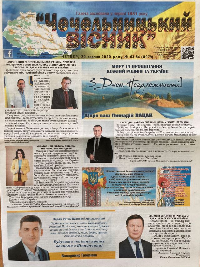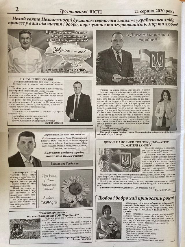 Також у серпні в районних газетах виходила велика кількість привітань із Днем Незалежності від імені депутатів та інших місцевих політиків – голови ОДА Сергія Борзова, народних депутатів Лариси Білозір, Миколи Кучера, Руслана Демчака, Геннадія Вацака, Ірини Борзової, Олега Мейдича, екс-прем’єра Володимира Гройсмана, депутатів місцевих рад, керівників районів та громад тощо.