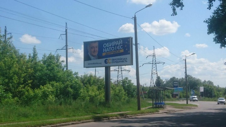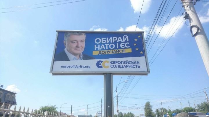 Так, у Вінниці розміщена зовнішня реклама політичної партії «Європейська солідарність». У місті встановлено білборди із зображенням Петра Порошенка та написом «Обирай НАТО і ЄС. Долучайся! Європейська солідарність».