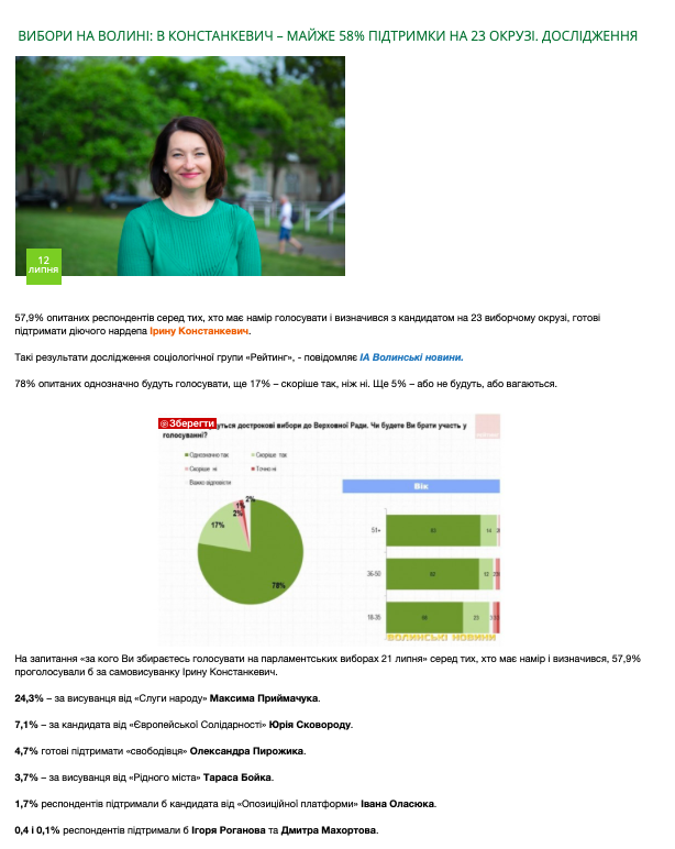 На офіційному сайті чинної народної депутатки і кандидатки в депутати по одномандатному виборчому округу №23 Ірини Констанкевич (самовисування) та на офіційній сторінці кандидатки у Facebook 12 липня розмістили публікацію під назвою «Вибори на Волині: В Констанкевич – майже 58% підтримки на 23 окрузі. Дослідження». Виявлені публікації містять посилання на аналогічний матеріал на сайті ІА «Волинські новини».