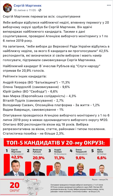 Результати іншого соціологічного опитування поширив на своїй сторінці у Facebook 15 липня кандидат по одномандатному виборчому округу №20 Сергій Мартиняк (самовисування). Такий самий матеріал під назвою «Сергій Мартиняк перемагає всіх: соцопитування» опублікували два інтернет-видання «Район.Локачі» та «Район.Горохів» 16 та 17 липня відповідно. Публікація містить відомості про назву організації, яка здійснювала дослідження, час проведення, територію, де воно здійснювалось, розмір та спосіб формування соціологічної вибірки, метод опитування, точне формулювання питань та можливу статистичну похибку. Втім, знову ж таки не зазначається замовник опитування.