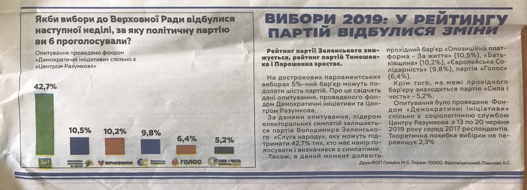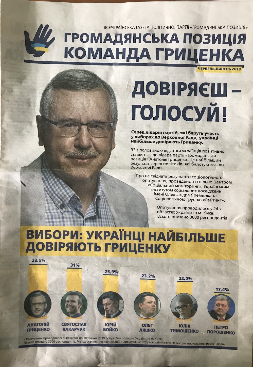 Інший виявлений факт стосувався всеукраїнської газети політичної партії «Громадянська позиція» за червень-липень 2019 року. На першій сторінці газети розмістили публікацію «Вибори: українці найбільше довіряють Гриценку». Вона містить відомості про назву організації, яка здійснювала дослідження, час проведення, територію, де воно здійснювалось, розмір формування соціологічної вибірки, метод опитування. Втім, тут не вказано точного формулювання питань, можливу статистичну похибку, способу формування соціологічної вибірки та замовника дослідження.