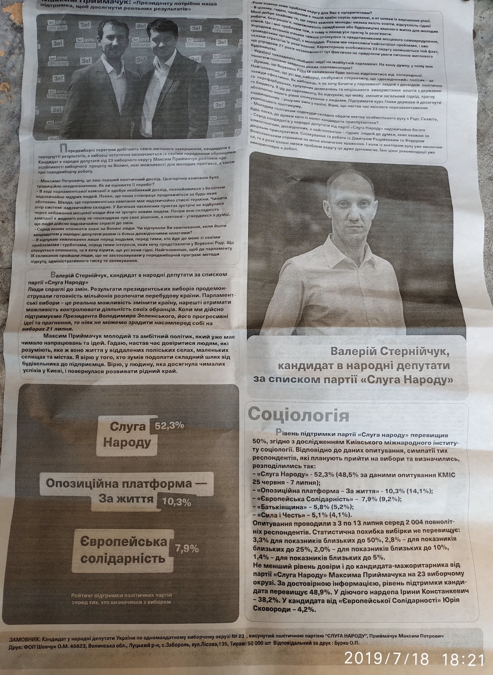 Активісти на користь кандидата від «Слуги народу» у виборчому окрузі №23 Максима Приймачука 18 липня у смт Маневичі поширювали газету, в якій опублікували соціологічне дослідження іншої соціологічної організації. Результати двох опитувань кардинально відрізняються, втім, вони проводились в різний часовий проміжок. Разом з тим, у газеті «Зе! Депутат слуга народу» опублікували результати соцопитування щодо виборів без зазначення замовника, відомостей про територію, де воно здійснювалось, спосіб формування соціологічної вибірки, метод опитування, точне формулювання питань.
