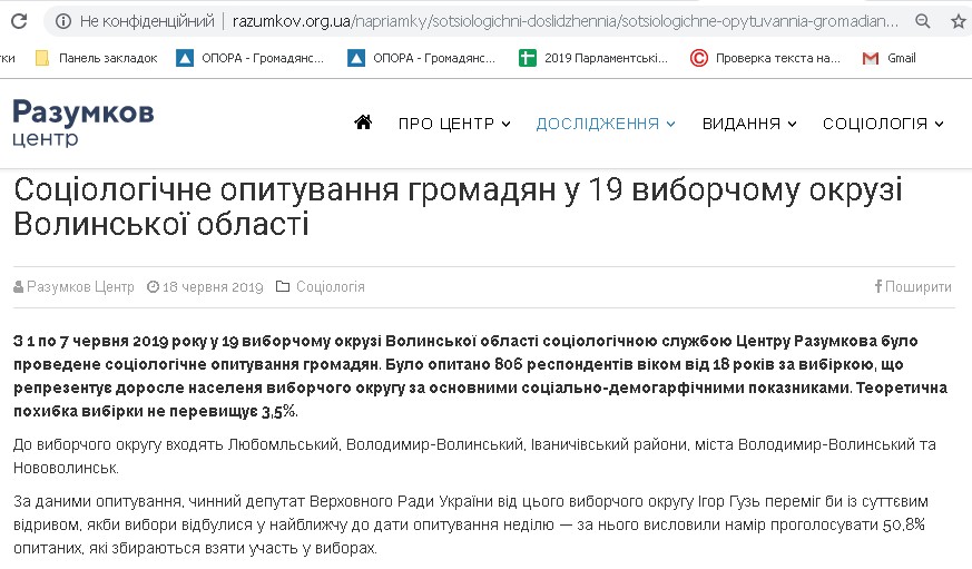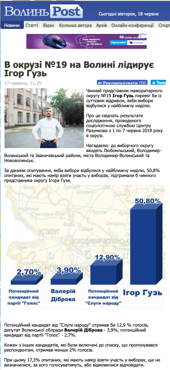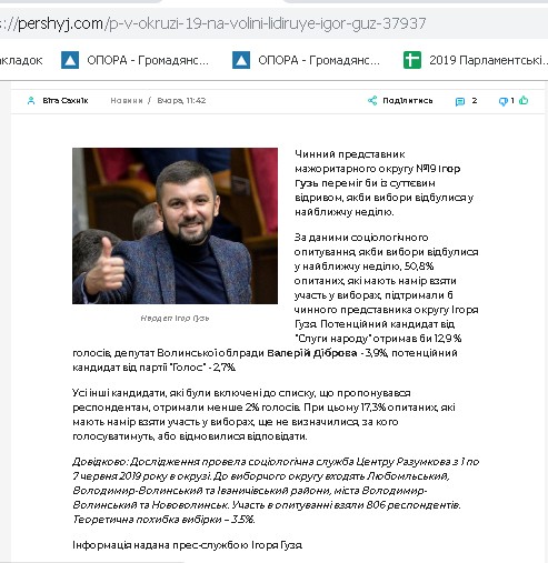 Протягом дня 17 червня новини із заголовком «В окрузі 19 на Волині лідирує Ігор Гузь» з’явилися на сторінках Інформаційних агентств «Волинські Новини» та «ВолиньPost», а також інтернет-видань «Волинська правда», «Кордон», «Буг», «Володимир Медіа», «Район. Любомль», «Район. Іваничі», «Район. Володимир-Волинський», «Волинь 24» (із однаковим заголовком «Ігор Гузь має на окрузі понад 50%-підтримку. Опитування»), Окрім того, ідентичний матеріал опублікувало всеукраїнське видання «Українский новинний портал».