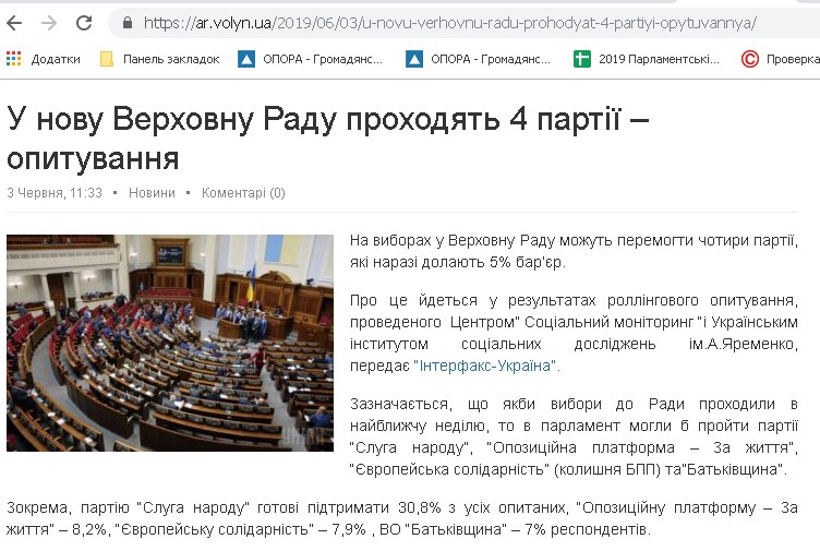 Разом з тим, 3 червня інтернет-видання «Волинське агентство розслідувань» розмістило матеріал «У Верховну Раду проходять 4 партії – опитування», який не містить інформації про замовника, спосіб формування вибірки, а також точного формулювання питання.