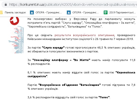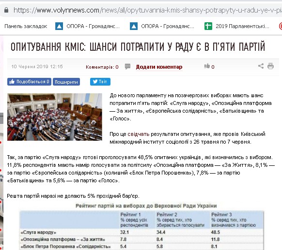 Того ж дня ІА «Волинські Новини» опублікувало новину «Опитування КМІС: шанси потрапити у раду є в п’яти партій». У тексті дописі немає інформації про замовника, спосіб формування соціологічної вибірки опитаних та не вказано методу, за яким проводили опитування.