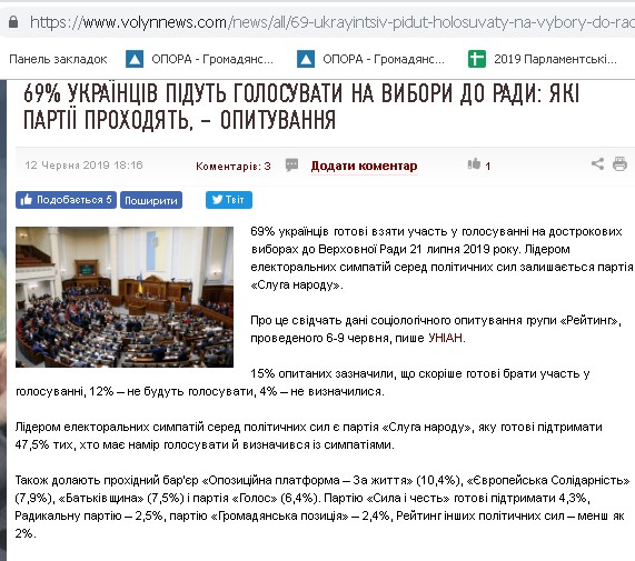 12 червня ІА «Волинські новини» опублікувало новину «69% українців підуть голосувати на вибори до ради: які партії проходять, – опитування». Вона не містить інформацій про точне формулювання питань та замовника соціологічного опитування.