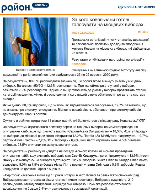 Зокрема, 2 жовтня в інтернет-виданні «Район.Ковель» з’явилася новина «За кого ковельчани готові голосувати на місцевих виборах». У матеріалі посилаються на результати досліджень громадської організації «Інститут аналізу державної та регіональної політики», опубліковані у мережі Facebook. У матеріалі відсутні відомості про можливу статистичну похибку, точне формулювання питань, замовника, спосіб формування вибірки.