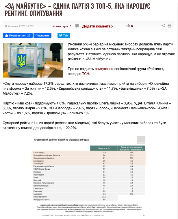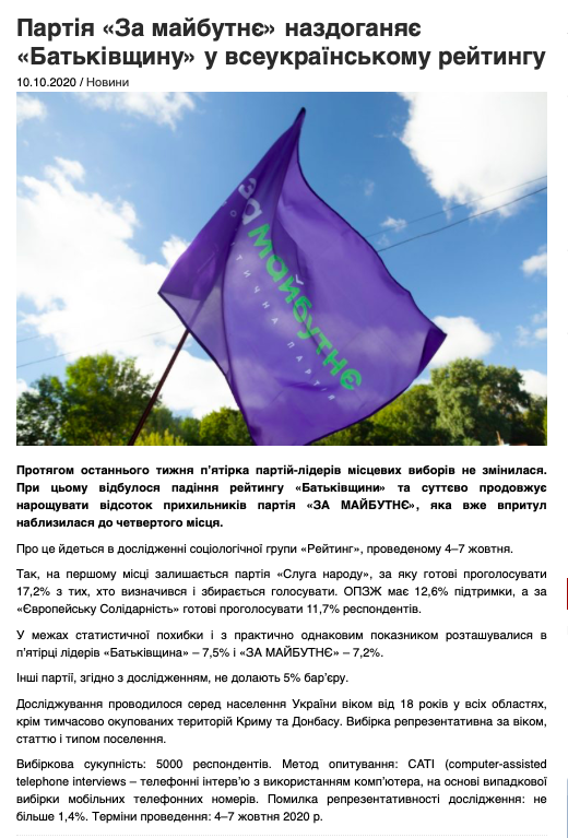 Інформаційне агентство «Волинські новини» 8 жовтня розмістило результати опитування із заголовком «За майбутнє» – єдина партія з топ-5, яка нарощує рейтинг. Опитування». Йдеться про публікацію результатів досліджень соціологічної грипи «Рейтинг». Тут не міститься даних про точне формулювання питань, котрі ставлять респондентам та відсутня інформація про замовника.