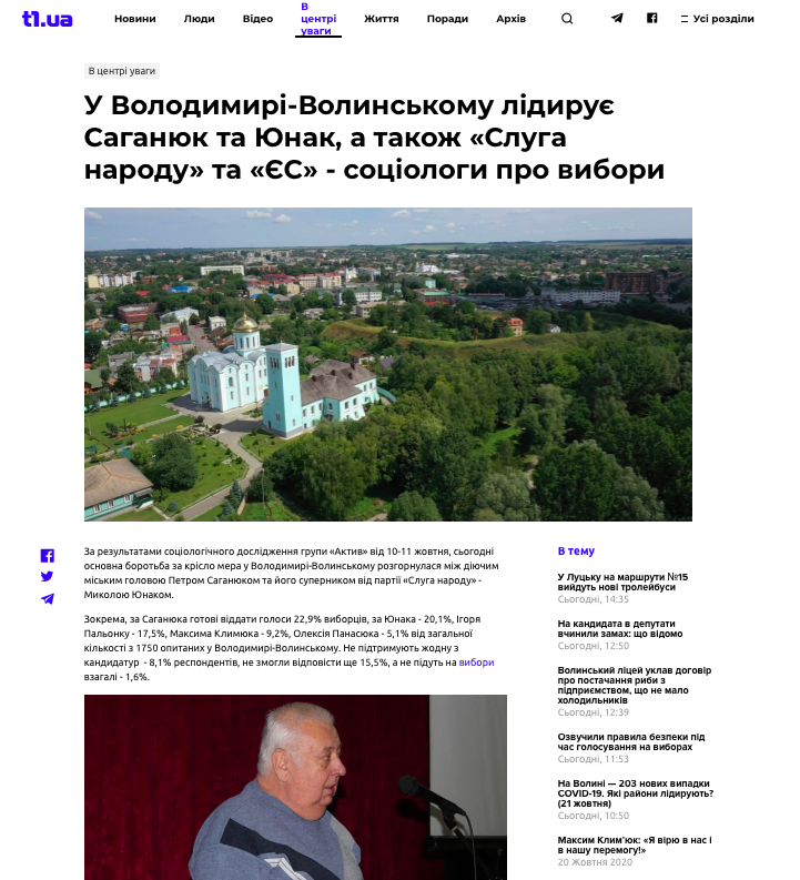 18 жовтня на сторінках видання «t1.ua – Твій портал» вийшла публікація «У Володимирі-Волинському лідирує Саганюк та Юнак, а також «Слуга народу» та «ЄС» - соціологи про вибори». У ньому посилаються на результати соціологічного дослідження групи «Актив» та містяться лише відомості про час, територію, точне формулювання питань, вікову репрезентативність вибірки.