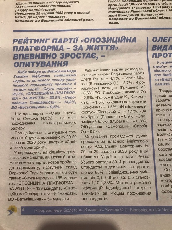 Окрім того, в інформаційному бюлетені «Опозиційна платформа – За життя. Волинь», котрий у жовтні поширювали у Луцьку, містилася публікація із посиланням на результати досліджень рейтингів партій. Йдеться про матеріал на сторінці №4 «Рейтинг партії «Опозиційна платформа – За життя» впевнено зростає, - опитування». Тут не вказано точного формулювання питань, котрі ставили респондентам та даних про замовника.