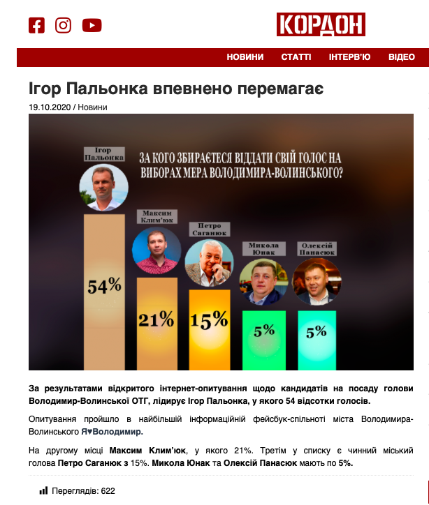 19 жовтня в інтернет-виданні «Кордон» було виявлено матеріал «Ігор Пальонка впевнено перемагає», в якому зазначені результати «відкритого інтернет-опитування» щодо кандидатів на посаду голови Володимир-Волинської територіальної громади. Окрім того, в який спосіб опитування проводилось і які питання ставились респондентам, жодної іншої інформації, передбаченої Кодексом, тут не зазначили.