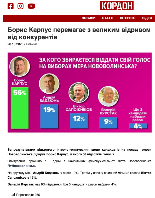 У цьому ж виданні наступного дня, 20 жовтня, опублікували матеріал «Борис Карпус перемагає з великим відривом від конкурентів», в якому оприлюднили результати іншого «відкритого інтернет-опитування» щодо кандидатів на посаду Нововолинського міського голови. Реквізити опитування зазначені такі ж самі: точно сформульоване питання і місце його проведення.