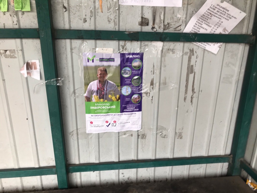 14 жовтня у селищі Ратне на зупинці громадського транспорту спостерігач ОПОРИ виявив агітаційну листівку на користь кандидата у депутати Волинської обласної ради Михайла Імберовського («За майбутнє»). Поліграфія містила інструкцію, як проголосувати за кандидата, та інформувала про зроблене у районі.