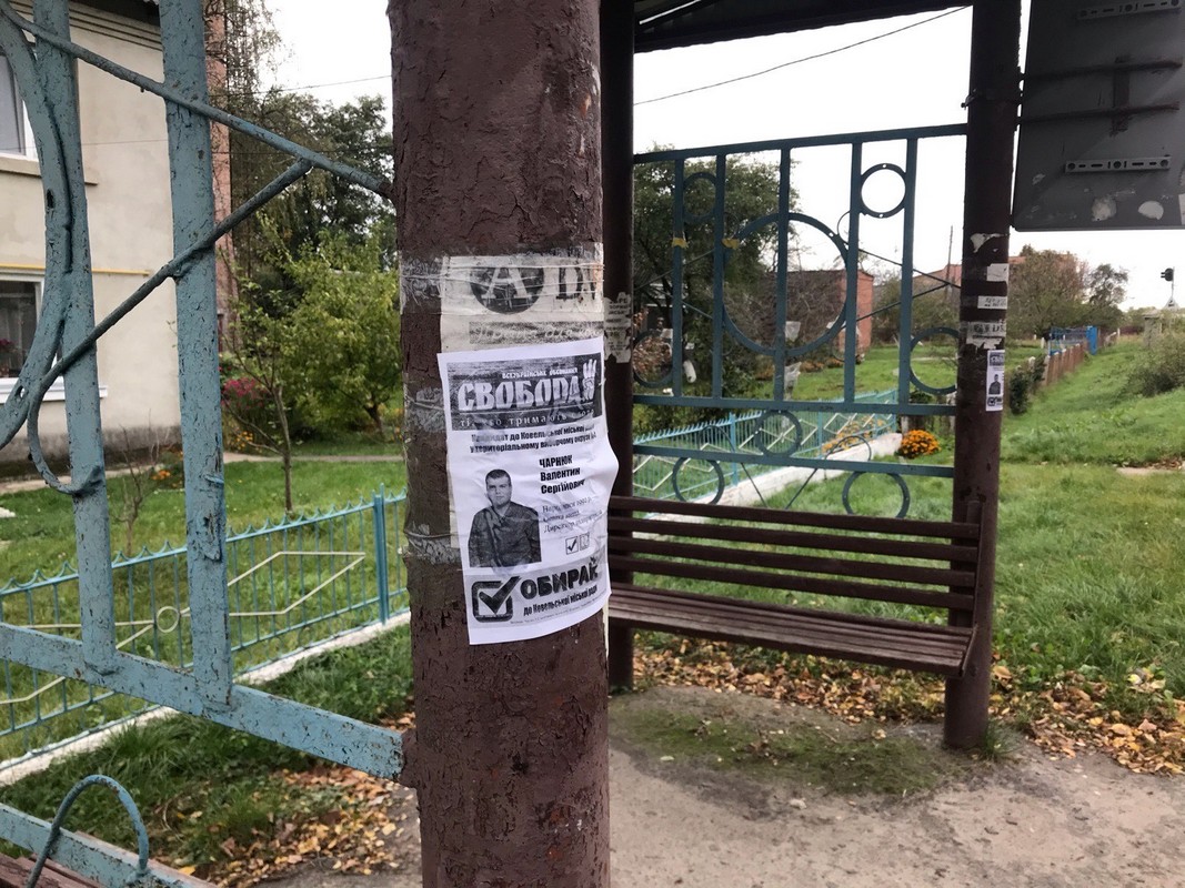 Окрім того, у Ковелі також на зупинці громадського транспорту зафіксували дві листівки на користь кандидата у депутати міської ради Валентина Чарнюка (ВО «Свобода»). Вони містили деяку біографічну інформацію про кандидата, його фото та номер у бюлетені.