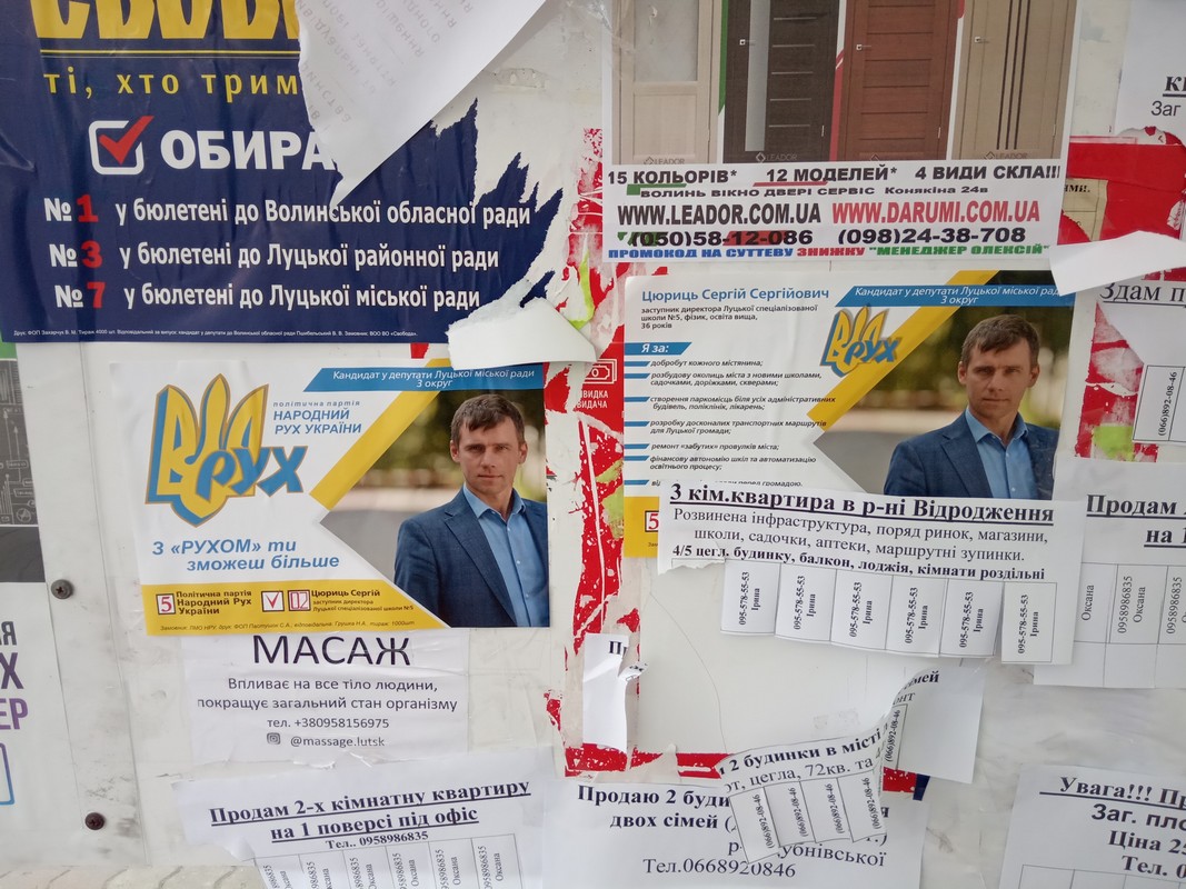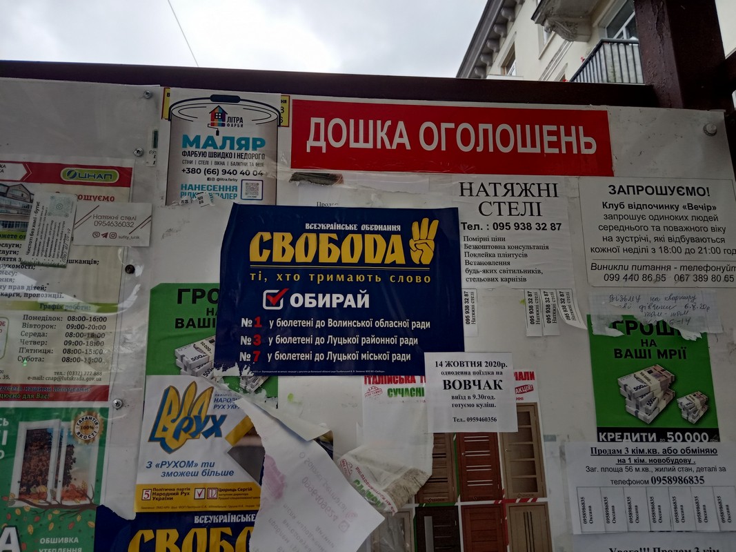13 жовтня спостерігачка ОПОРИ у Луцьку виявила агітаційні матеріали на користь «ВО «Свобода» та кандидата від Народного Руху України, розміщені на зупинці громадського транспорту на проспекті Волі. Йдеться про листівку ВО «Свобода», де вказані номери партії на виборах до Луцької міської, районної та Волинської обласної рад. На двох агітках із символікою Народного Руху України натомість зображений кандидат до Луцької міської ради Сергій Цюриць, вказаний номер партії та кандидата у бюлетені, а також перераховані пункти, котрі підтримує кандидат.