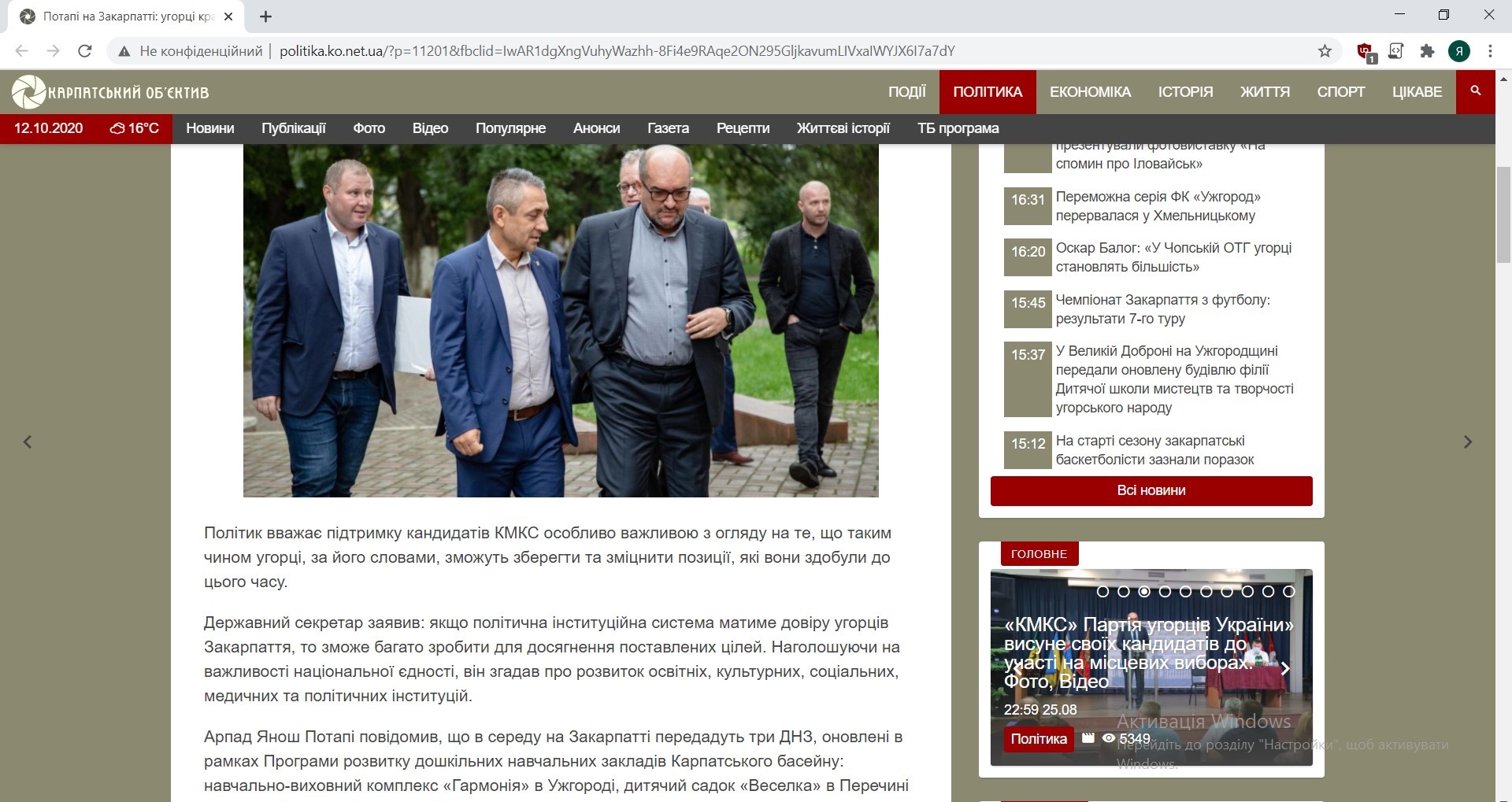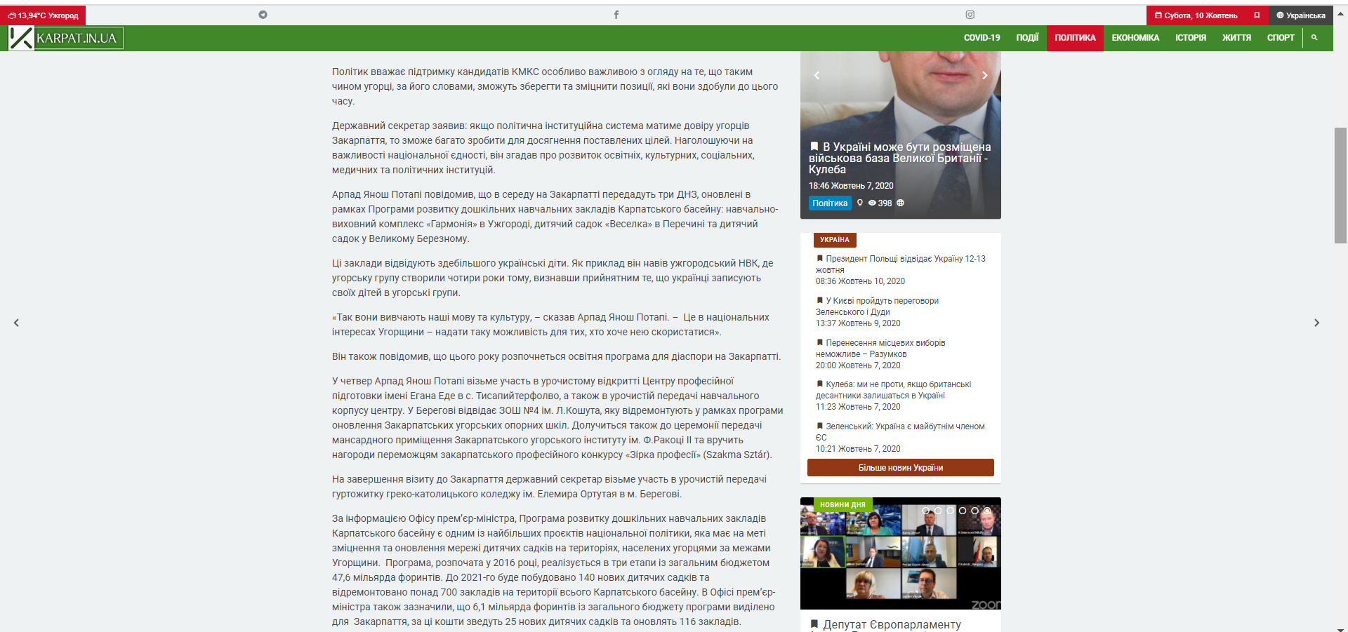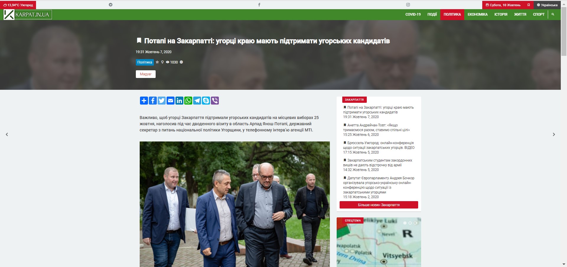1. На офіційному сайті політичної партії “КМКС “Партія угорців України” 9 жовтня розміщено повідомлення про візит Державного секретаря Угорщини з питань національної політики Яноша Арпада Потапі (Державний секретар в апараті прем'єр-міністра з 2014 р., відповідає за національну політику) в ужгородську угорськомовну школу. У публікації розмістили цитату Потапі, в якій іноземний політик закликає підтримати “КМКС “Партію угорців України” на місцевих виборах в Україні 25 жовтня 2020 року.
