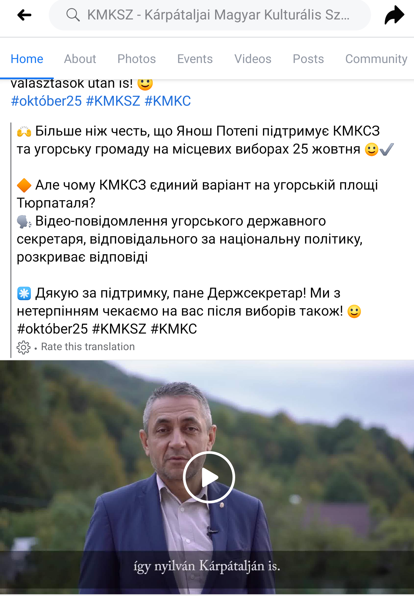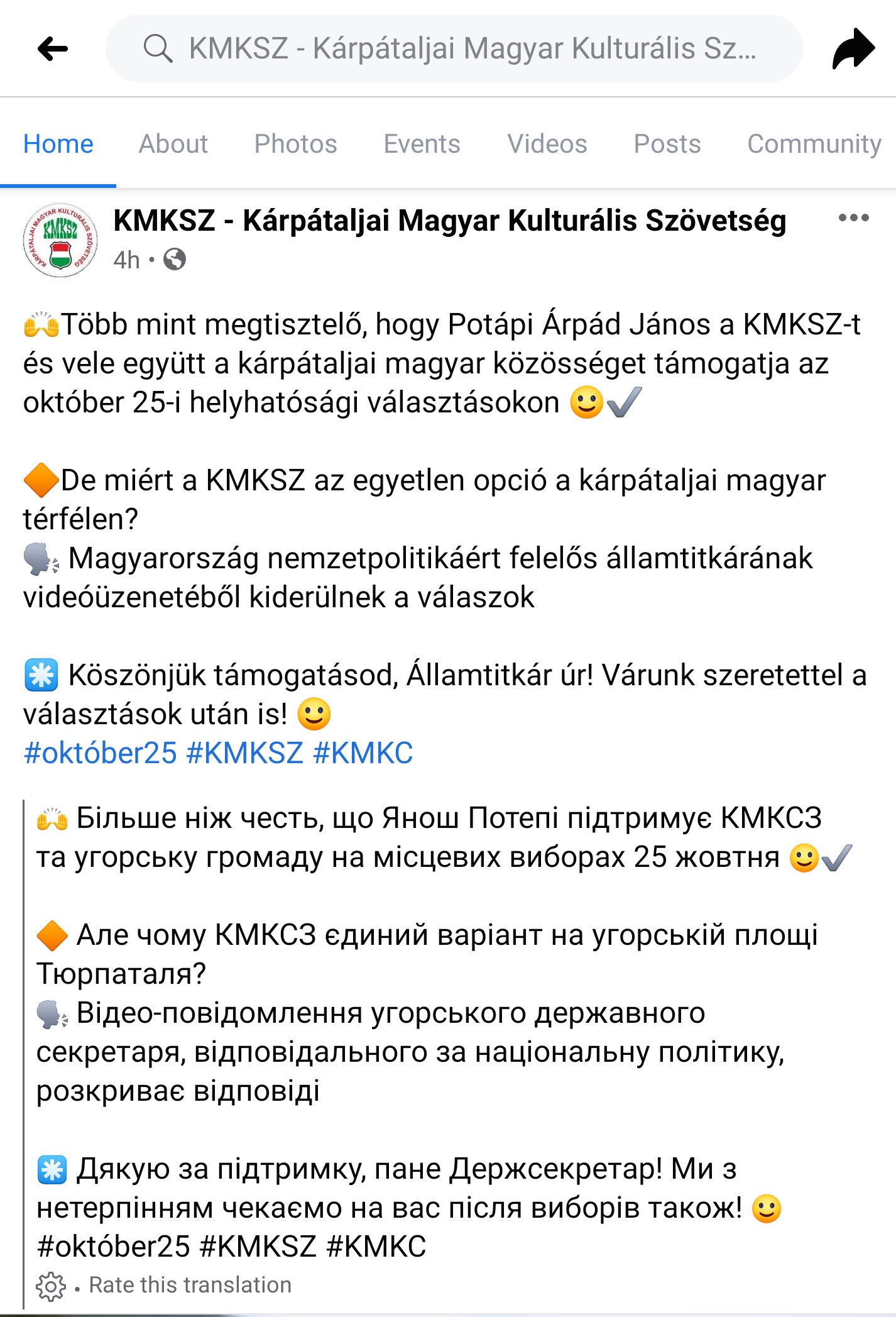 Неофіційний переклад: “Дуже важливо, щоб угорці Закарпаття підтримували угорських кандидатів на місцевих виборах в Україні 25 жовтня. Támogatás ️ Підтримка кандидатів КМКС - Закарпатської угорської культурної асоціації особливо важлива, оскільки таким чином угорці Закарпаття можуть зберегти або навіть зміцнити свої позиції”.