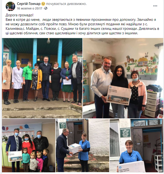 «Вже в котре до мене, люди звертаються з певними проханнями про допомогу. Звичайно я не можу дозволити собі пройти повз. Мною були розглянуті подання які надійшли з с. Калинівка, с. Майдан, с. Пояски, с. Сущани та багато інших селищ нашої громади. Дивлячись в ці щасливі обличчя, сам стаю щасливішим і хочу ділитися цим щастям з іншими», – написав кандидат та опублікував фотозвіт.
